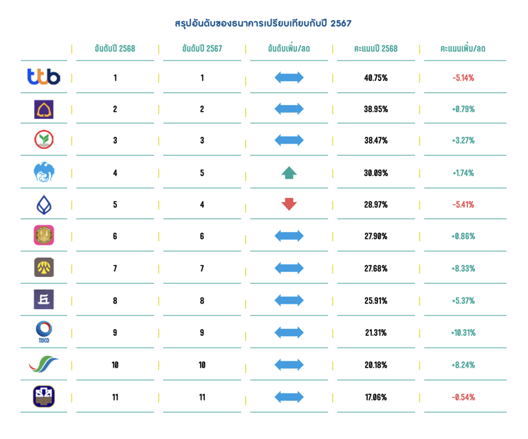 ธนาคารที่ได้คะแนนสูงสุด 5 อันดับแรก ได้แก่ ธนาคารทหารไทยธนชาต (40.75%) ธนาคารไทยพาณิชย์ (38.95%) ธนาคารกสิกรไทย (38.47%) ธนาคารกรุงไทย (30.09%) และธนาคารกรุงเทพ(28.97%) โดยหากพิจารณาเฉพาะคะแนนของธนาคารพาณิชย์ 8 แห่ง พบว่า ธนาคารพาณิชย์ในภาพรวมมีคะแนนเฉลี่ยเพิ่มขึ้นจาก 31.06% ในปี พ.ศ. 2567 เป็น 31.52% ในปี พ.ศ. 2568 ขณะที่สถาบันการเงินเฉพาะกิจของรัฐ 3 แห่ง พบว่า คะแนนเฉลี่ยเพิ่มขึ้นเช่นกันจาก 21.15% ในปี พ.ศ. 2567 เป็น 21.71% ในปี พ.ศ. 2568