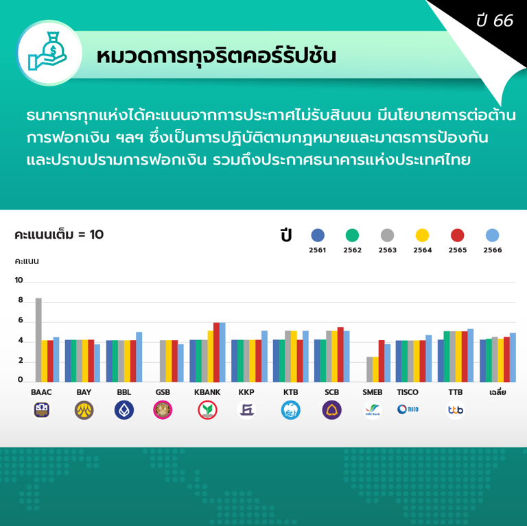 ธนาคารทุกแห่งได้คะแนนจากการประกาศไม่รับสินบน มีนโยบายการต่อต้านการฟอกเงิน ป้องกันการสนับสนุนทางการเงินกับกลุ่มก่อการร้าย มีการเปิดเผยผู้ได้รับผลประโยชน์ที่แท้จริง และมีมาตรฐานเพิ่มเติมเมื่อทำธุรกิจที่เกี่ยวข้องกับบุคคลที่มีส่วนเกี่ยวข้องทางการเมือง ซึ่งการประกาศนโยบายเหล่านี้เป็นการปฏิบัติตาม พ.ร.บ. ป้องกันและปราบปรามการฟอกเงิน พ.ศ. 2542 มาตรการป้องกันปราบปรามการฟอกเงิน และการต่อต้านการสนับสนุนทางการเงินแก่การก่อการร้าย และประกาศธนาคารแห่งประเทศไทย (ธปท.) เรื่อง หลักเกณฑ์การรับฝากเงินหรือการรับเงินจากประชาชน (Guideline on Acceptance of Deposits or Money from Customers)